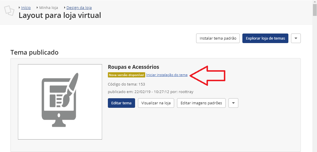 - Note, que caso esteja utilizando um tema desatualizado, será apresentada a seguinte mensagem "Nova Versão Disponível".