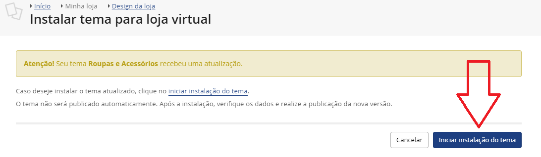 - Para realizar a atualização, basta clicar em "Iniciar Instalação do Tema".