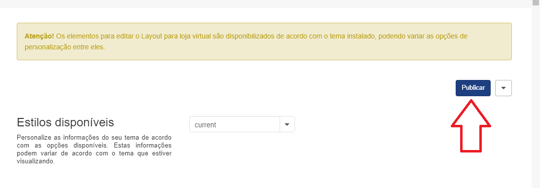- Você cairá dentro da página de edição do tema atualizado, e caso deseje, poderá já clicar em "Publicar" para que o tema, de fato, seja utilizado em sua loja virtual