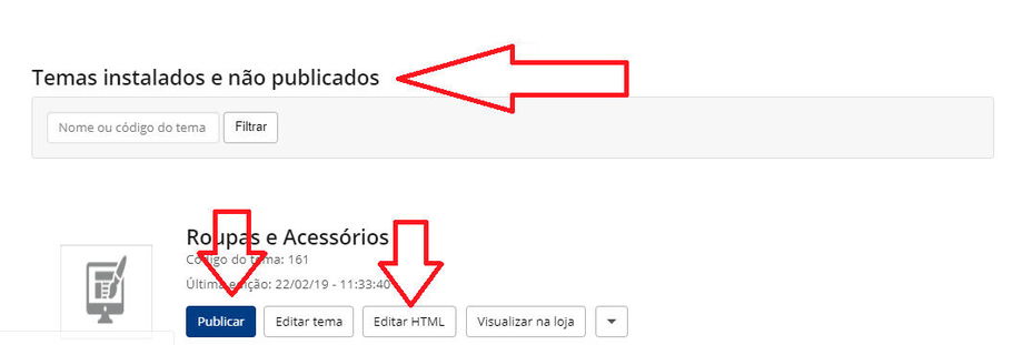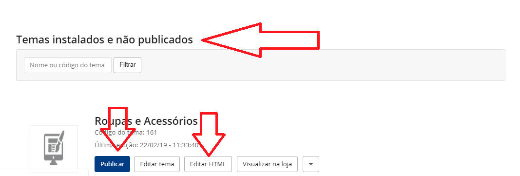 Mas fique atento, ao realizar a atualização de um tema, será gerado um novo tema dentro da página de "Aparência da loja", e você encontrará ele em "Temas Instalados e Não Publicados".
