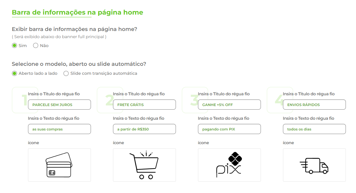 Aviso importante: Para alterar as cores dos ícones do banner tarja, é necessário fazer o upload dos ícones já na cor desejada. Esta funcionalidade está localizada na aba 2, sob "Barra de informações na página inicial".