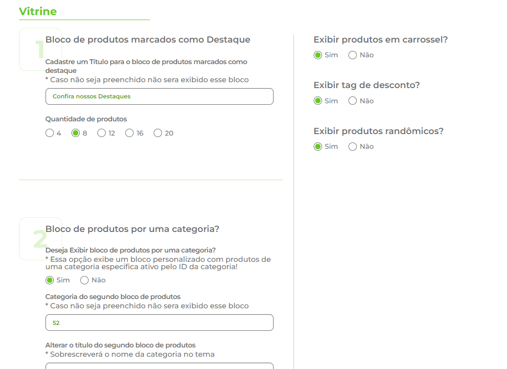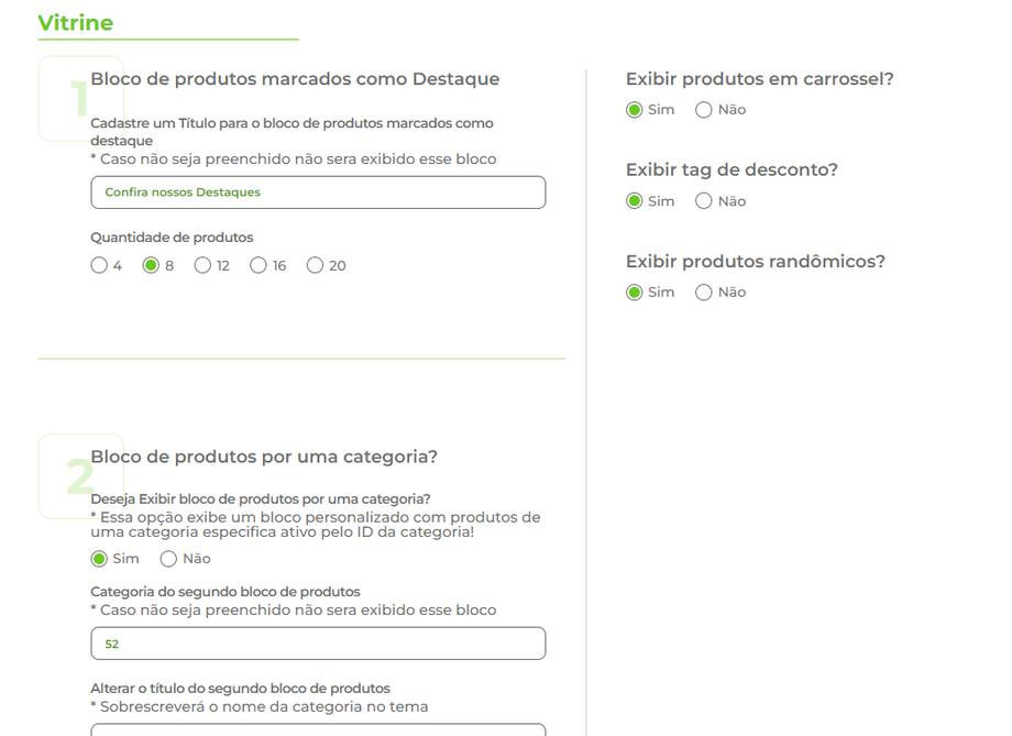 Quantidade de Produtos: Defina quantos produtos serão exibidos na página inicial, permitindo que você destaque os itens mais relevantes ou populares.