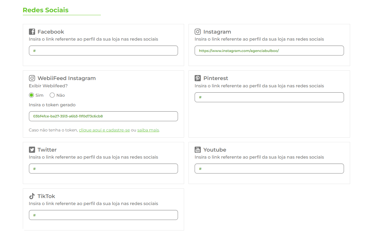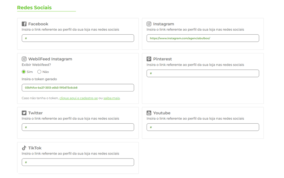Adição de Links: Você poderá inserir os links de cada rede social onde sua loja está presente, como Facebook, Instagram, Twitter, LinkedIn, entre outros. Isso cria um acesso rápido e direto para seus clientes, incentivando-os a seguir suas páginas e interagir com o conteúdo que você compartilha.