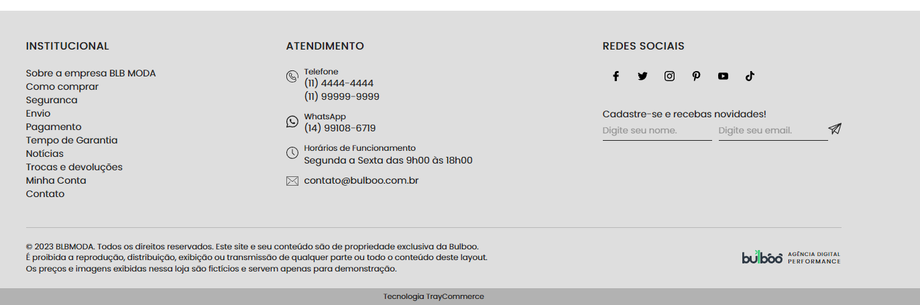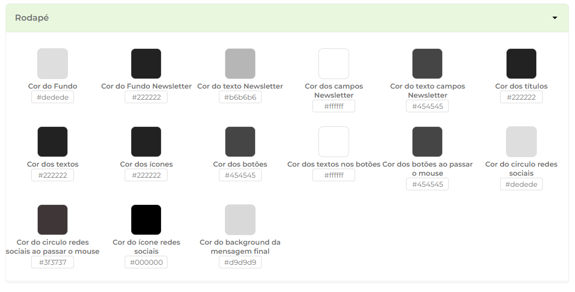 As cores do rodapé da sua loja são totalmente editáveis. Você pode alterar a cor de fundo, dos textos e dos ícones conforme desejar.