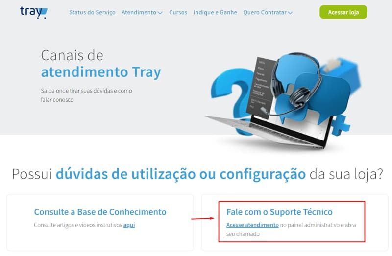 Caso precise de algum suporte relacionado ao tema ou a plataforma Tray, entre em contato diretamente pelo link https://www.tray.com.br/canaisdeatendimento/ e clicando em Fale com o Suporte técnico, como mostrado no print abaixo.