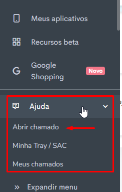 Você também poderá abrir um chamado com o nossa equipe de Suporte Tray diretamente através do painel administrativo da plataforma, indo no menu lateral esquerdo, na seção de Ajuda e clicando em Abrir chamado, como mostra o print abaixo:
